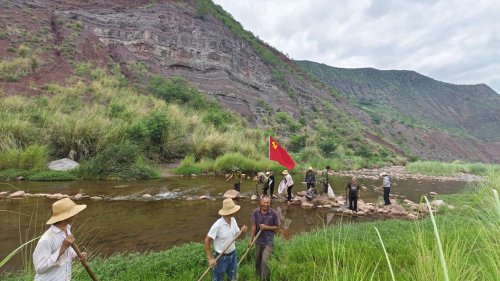 图为:东坡傣族乡所所卡村委会党员志愿队进行水域垃圾清理