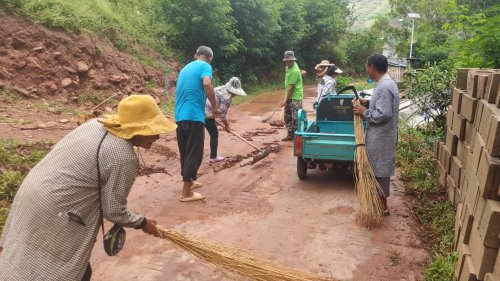 图为:东坡村委会安茂里村村民清理雨后道路淤泥