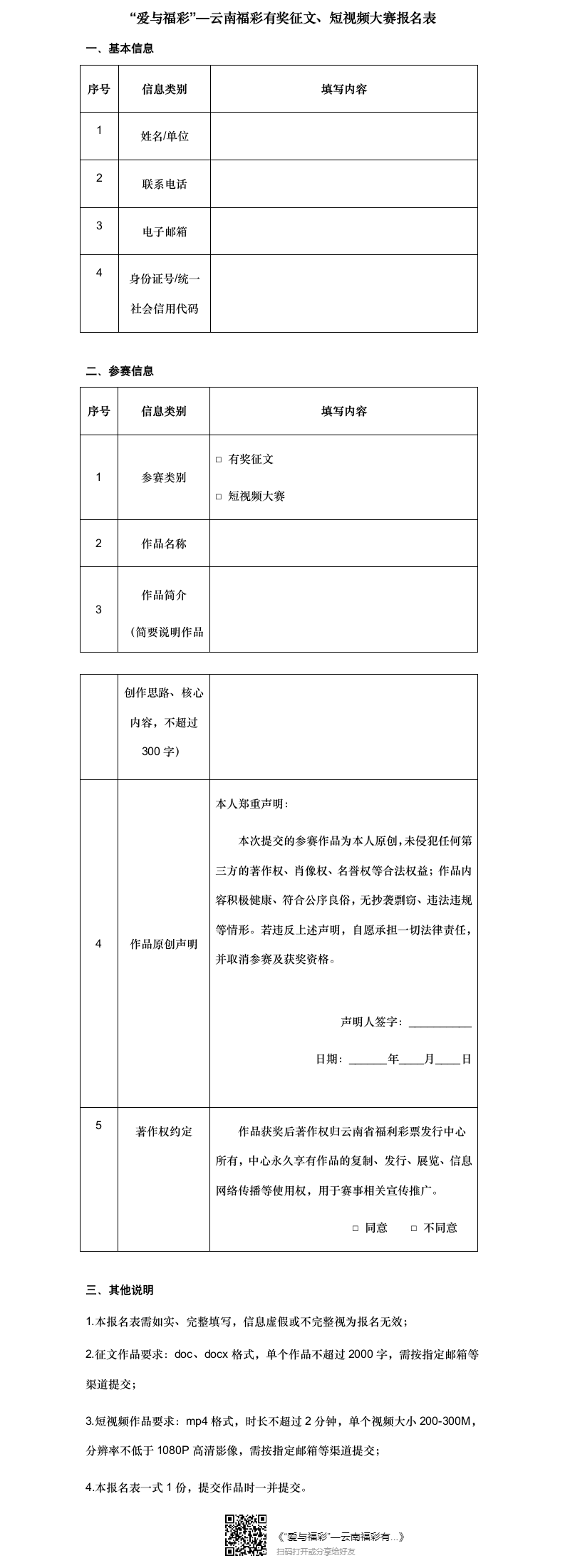 3.需填写《“爱与福彩”云南福彩有奖征文、短视频大赛报名表》,与作品一并提交(报名表需如实完整填写,信息虚假或不完整视为报名无效)。